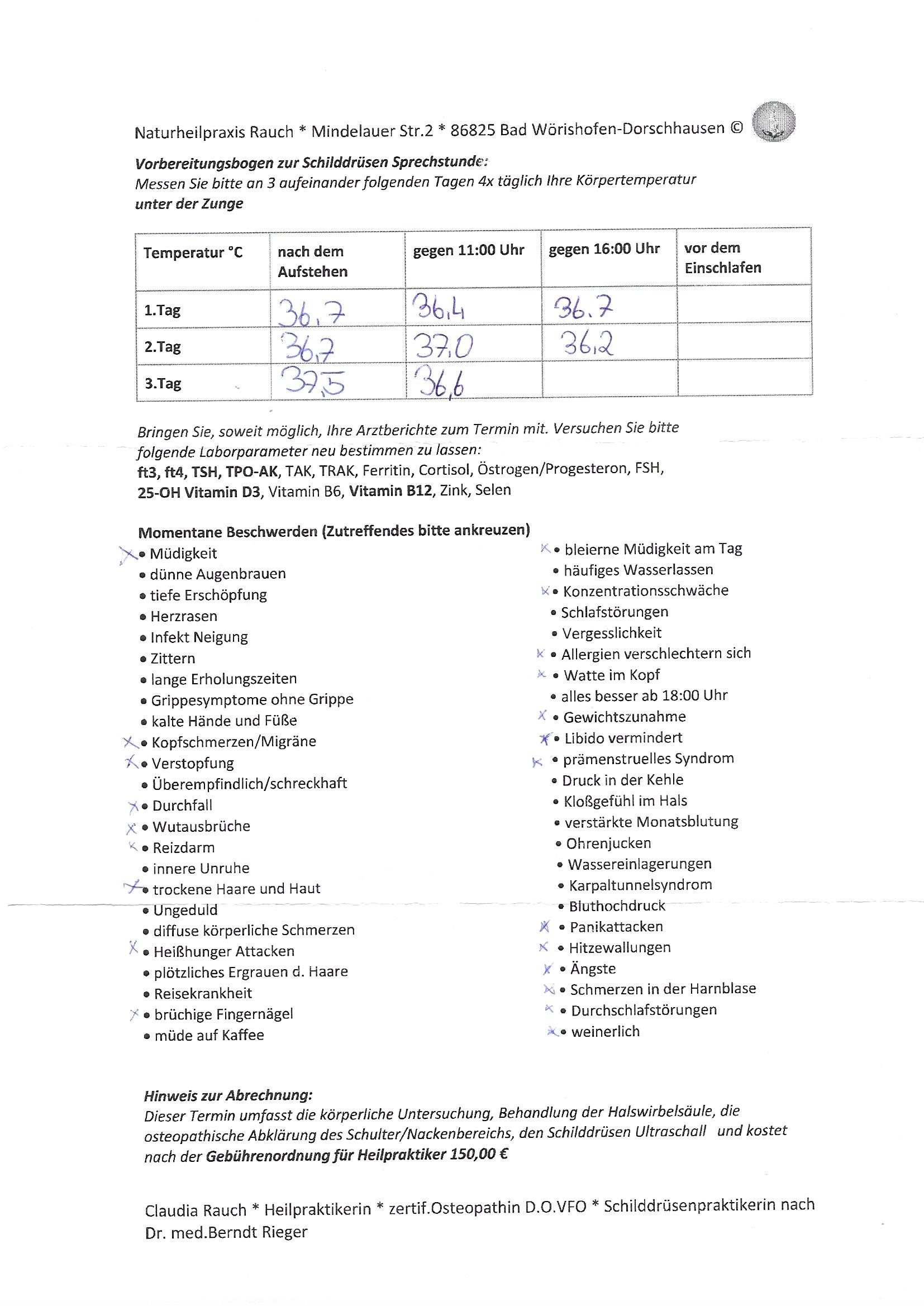Sie messen vor unserem Termin mit einem digitalen Fieberthermometer 4 x täglich - an 3 hinter einander folgenden Tagen die Körpertemperatur unter der Zunge - zu den Zeiten, die auf dem Bogen oben bei der Tabelle stehen.